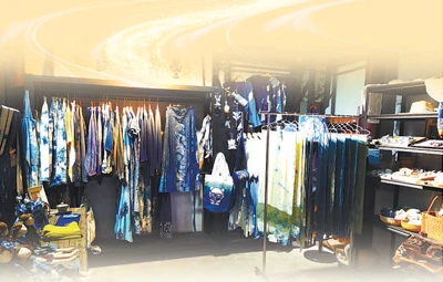 冬日暖阳下,前仓镇大陈村游人不少。永康市墨时草木染非遗工坊晾布场上,蓝绸飘飘。产品展示室里,马面裙、衬衫、丝巾等各式古典味十足的时装引人驻足,茶席、靠枕、雨伞等生活用品琳琅满目。