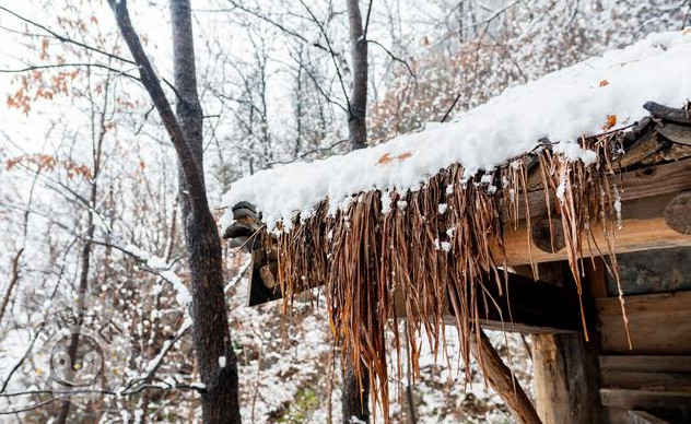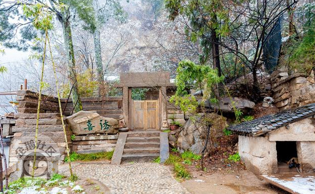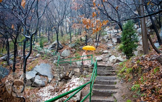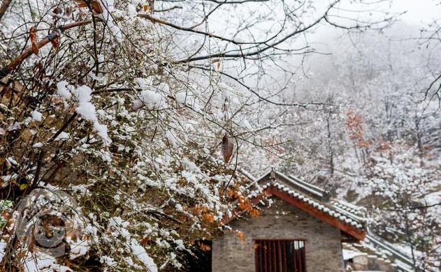 一路上山林静谧,黄叶满山,稍有雪花落在枝杈,又坠于湿泥,了无踪影。一夜的雪在山下还未积住,但过了半山腰,薄薄地就有雪景可看了。