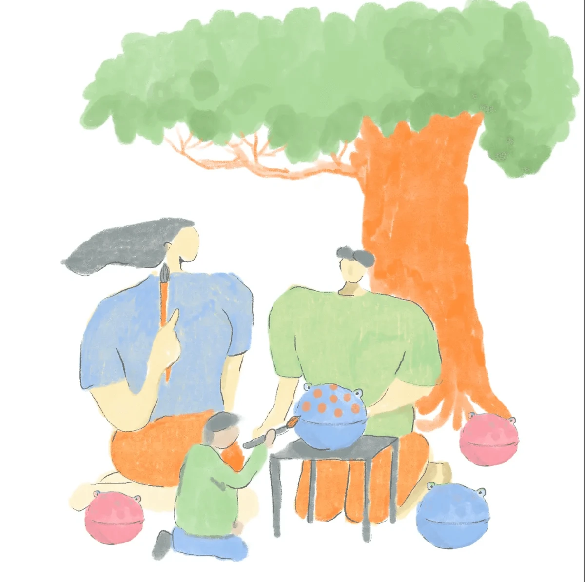 在岬角地質區之前有一處能讓遊客安心創作的戶外空間,這裡綠樹環繞、仿真的女王頭與俏皮公主、模擬奇岩怪石的可愛公仔錯落,一家大小就在綠蔭底下席地而坐,或是圍繞著木椅齊聚彩繪手中的浮球。