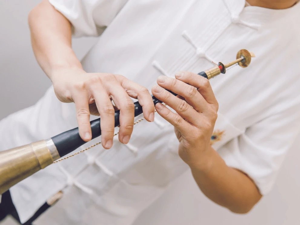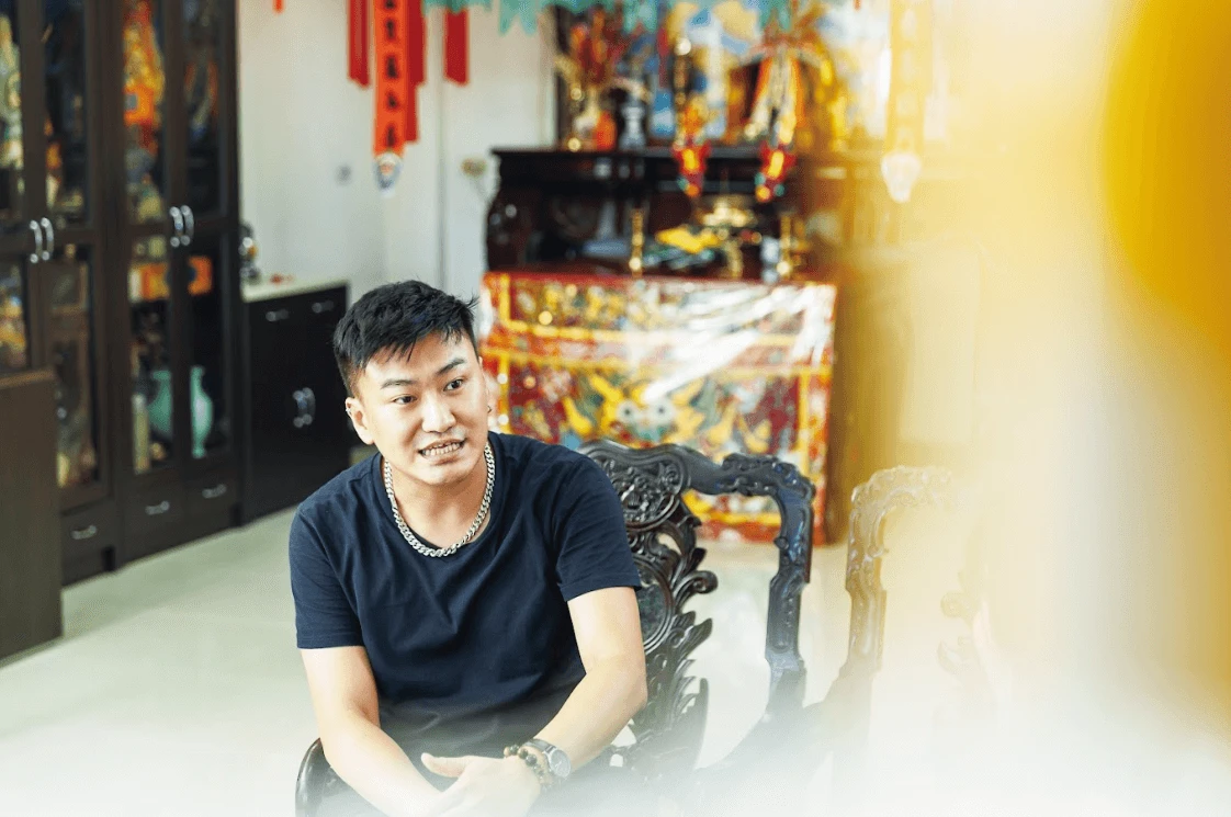 他從小在傳統農業大家庭長大,跟著爺爺參加各種在地慶典與宗祠祭儀,像是觀音媽過頭、三界公春祈秋報、中元普渡等等,耳裡聽著誦經聲與北管聲,從熟悉到熱愛,後來相繼加入了北管樂隊和道壇,目前是「桃園妙應壇」的 一員。他最拿手的是嗩吶,但其他管弦也會演奏,經文也熟,祝禱詞也能寫,他說這些不是拿來炫耀的,是用來對人(或我們)表達敬意的。演奏不是表演,是一種邀請,一種陪伴。