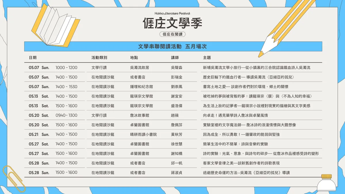5月場邀請臺灣知名文學評論家 彭瑞金、美濃在地耕讀作家 劉崇鳳、臺北地方異聞工作室 謝宜安、臺灣新生代小說家 盛浩偉、苗栗縣卓蘭客家饒平文化負責人 詹佩芬、文藝首獎小說家及「黃秋芳創作坊」負責人 黃秋芳、客家音樂創作人 徐世慧、《生來憂傷》詩人 謝知橋、客籍詩人及南庄鄉愛鄉協進協會理事長 邱一帆、陽明交通大學客家文化學院人文社會學系副教授 蔣淑貞、中台科技大學USR計畫執行專員 趙蘋、巨埔社區發展協會理事長 吳聲淼,一起品味客家文學的魅力!
