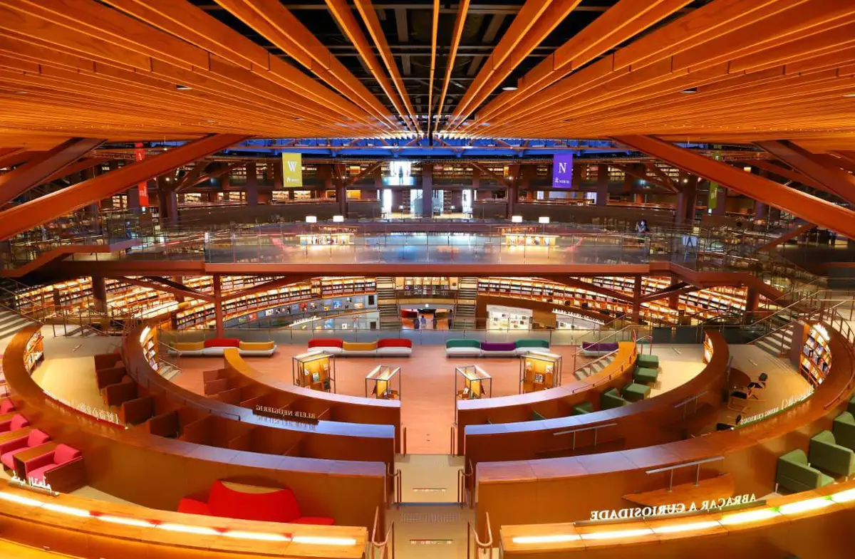 步入館內,更是一場視覺與感官的饗宴。圖書館內部採用圓形劇場般的挑高設計,讓大廳空間顯得更加寬闊、通透。正中央的圓形區域如同舞台,館藏的30萬冊圖書環繞四周,堆疊而上,無論站在哪個角度,都能感受到閱讀與建築美學交融的魅力。