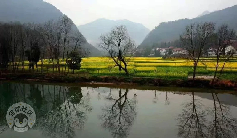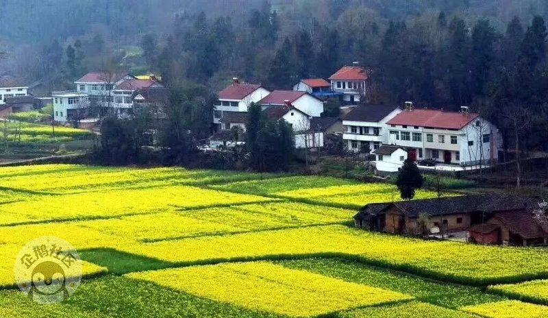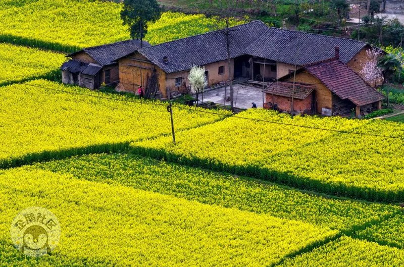 古朴的农舍掩映在金黄的花海中,好一幅陕南美丽的田园风光。