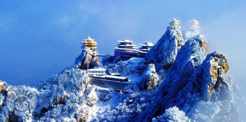 冬季的老君山银装素裹,阳光一出,金顶反射的黄光和白色的冰雪行成鲜明的对比。甚为壮观。
