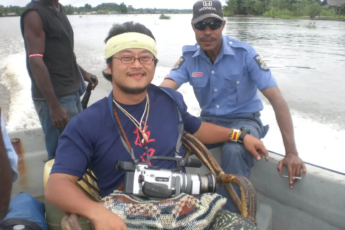 阿良帶著乾爹林昌明和弟弟林一凡到新幾內亞踏訪阿公當年當高砂義勇軍走過的叢林土地並拍成紀錄片_2009_莫三比克河上。