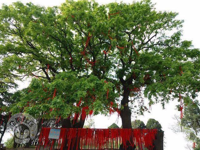 【唐明皇杨贵妃合植皂荚】树龄约1300年,生长在临潼骊山老君殿,树径均为0.8米,东边主干高2.76米,花繁实多,西边主干在1.2米处分杈,只长叶不结果。(图/网络搜集)