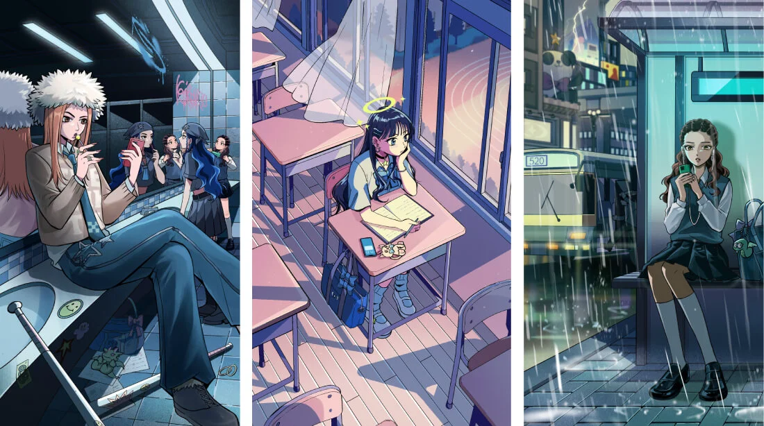 每位歌手皆有對應由金漫獎漫畫家Peter Mann所設計的漫畫角色,除了擁有虛構身分與校園證件照,還將同步推出角色視覺設定、Lo-Fi Girl 風格的動畫 MV、T@P® NFC 偶像小卡等擴充內容,整題融合少女漫畫語彙與Y2K設計感,構築出一個風格強烈、細節飽滿的視覺宇宙。