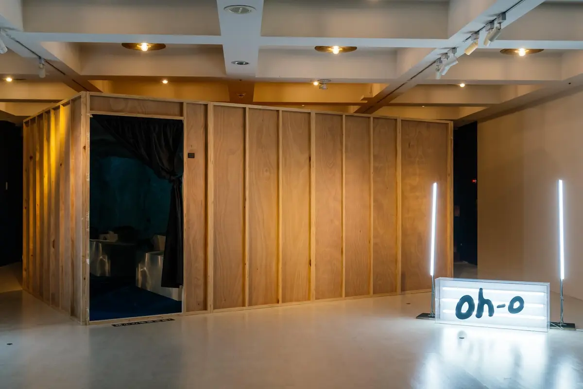 走出9樓電梯,就能看到吸引目光的Oh-o燈箱與燈管,迎接我們走入「向內凝視」的神秘獨立空間。Oh-o米糕團隊以舞台裝置結合聲音、複合媒材,邀請旅人沈浸式地感受作品,在視覺、音樂與動態燈光的交融流動間,回憶疫情期間的自處與沈澱,進而引發自我與外界對話,以及關於行旅、移住的更多可能。