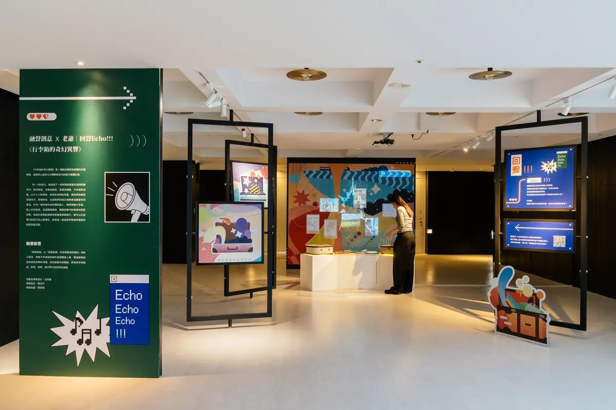 「行李箱的奇幻異響」位於7樓,是融聲創意團隊結合遊戲、聲音與視覺互動的作品,反映不同時空的機場廣播、列車車鳴、浪潮聲、行李箱滾輪聲,是召喚旅行記憶與經驗的媒介。提起行李箱,共感跨世代的旅行記憶;觸碰互動按鈕,猶如與人的貼心默契,與行李箱同頻共行。