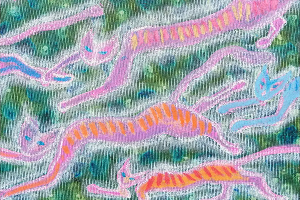 現在王家祥最主要的創作表達不再是寫作,「年輕時因為過度投入寫作把自己折磨到身心焦慮失調好多年,現在年紀越來越大了沒體力,寫作需要耗費大量的時間和精力投入,一隻狗救下來至少要養七、八年,每天處理都蘭狗園的事情,時間被切割得很碎,更無法專注於寫作。」他的創作抒發完全地轉向畫畫,「狗園忙完後就開始畫畫,畫到晚上沒有畫完,帶回家再畫。畫畫讓我覺得自己仍有生產力。」為了方便攜帶和郵寄,他多是以壓克力顏料畫在八號大小的畫布上,作品Po在臉書上展售。畫的主題大部份是融合真實與想像的風景,和他身邊最重要的夥伴流浪貓和狗兒,雖然他自謙偶爾才能賣出去一張畫,但目前為止生活剛好過得去,「還好還養得起狗,也會去市場收集免費的肉骨、去雞精工廠拿剩下的雞骨頭。我最高紀錄是同時照顧一百多隻狗,所幸現在外來移民多,動保意識提升,願意帶狗結紮的人也比較多了,動保團體願意辦理下鄉結紮,讓我們的壓力變少許多。」然而依然有源源不絕救不完的流浪動物啊!