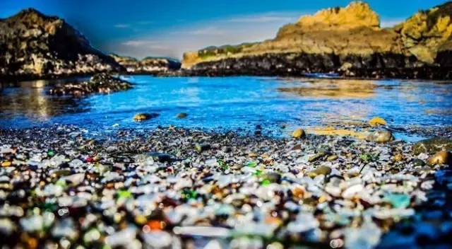 玻璃海滩(Glass Beach)位于美国加州布拉格堡。成片的海滩上布满了五彩的玻璃石。这么美的地方以前是个垃圾场,近20年的玻璃瓶等经过海浪的冲刷形成今天这道奇特的风景。不建议在海滩上作死求婚,毕竟戒指什么的丢在这应该真的蛮难找。出于对海滩的保护,当地不允许游客偷偷装一袋玻璃石回去铺鱼缸底做念想。2五彩蛋糕山张掖丹霞地貌