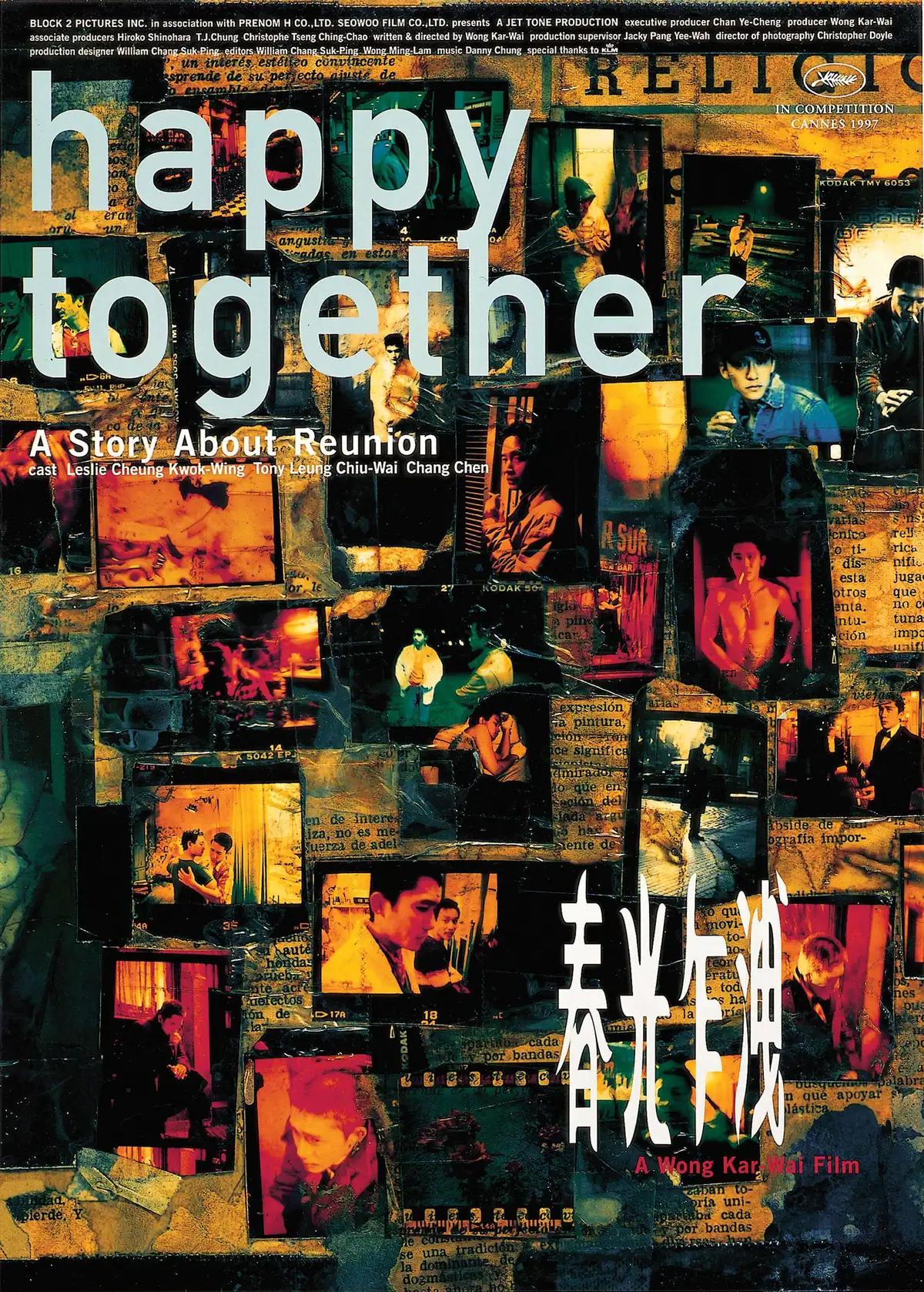 黃新滿:「我們緊接着為《春光乍洩》參加第五十屆康城影展設計宣傳主視覺。Wing Shya 在阿根廷拍攝時,已在酒店房間即興創作 Photo Collage(相片拼貼),就地取材,相片上有剪貼、煙頭、咖啡漬等痕跡,創作於回港後一直進行。另一方面,我們開始在一些電影劇照裏面,揀選有感覺的拼湊起來,嘗試呈現電影的氣氛。創作過程相當漫長,大家將不同劇照以多種形式組合,晚上吃過飯回來再三檢視,逐步找出較耐看的構圖。最後,Wing Shya 和我試了近百款設計,從中篩選三分之一拿到九龍城的澤東電影公司,讓王家衛和阿叔(張叔平)選出喜歡的設計。我感覺阿叔是透過欣賞畫作的角度評論,他會分析構圖佈局,例如說:『這個畫面很美,但那個位置欠缺了一點顏色。』」他不會給予直接指示,卻會引導你思考修改的方向。而王家衛善於運用心理戰,例如說:『是不是就這樣?只有這麼多?』他沒有答案,但想刺激你思考更多,為他帶來意想不到的東西。由於主視覺要在一星期後完成,我們就每日往來九龍城,不斷修改和檢視,直至大家滿意的作品誕生。」結果,王家衛憑《春光乍洩》成為首位奪得康城影展最佳導演的華人導演,晉身國際名導之列。