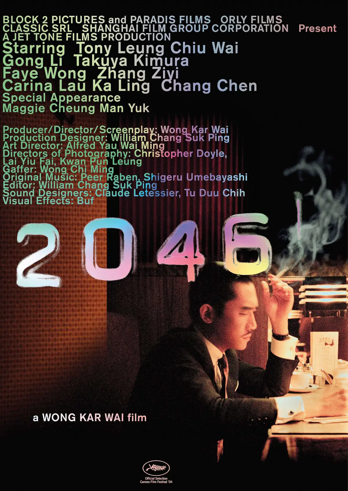 黃新滿為《二○四六》設計了三款宣傳主視覺,當時電影仍在拍攝中,歷時五年。「第一款海報用了早期於泰國取景的劇照製成Collage,裏面有梁朝偉、木村拓哉、王菲等巨星,其實還有王家衛的身影。當中的『二○四六』是透過Dymo 標籤機打字,再掃描到電腦排版。由於電影剛剛開拍,電影公司為免演員造型曝光,我就把畫面的對比度提高,只保留人物輪廓和一些細節,看不清具體造型和動作。同時,我想像中的二○四六年,或許經歷戰火洗禮而變成一個廢墟。完成構圖後,我將整個圖像左右反轉,並找印刷廠製作日常用於印刷工序的電板。我把電板放到工作室,讓它慢慢氧化,潔淨的金屬表面開始出現鐵鏽,棗紅色的,再慢慢變成黑色。這時候把電板進行Flat Copy(平版影印)作為完成品。到了第三年,劇組開始在港拍攝,第二款海報就是梁朝偉坐在金雀餐廳的一幕,印刷上使用了鐳射燙印效果;第三款則有木村拓哉和王菲等。這批海報主要用於康城影展,只作少量印刷,大約二百張,我自己也未及收藏。到了二○○四年,《二○四六》正式公映的時候,那批新款海報就是其他公司負責的,但效果也不錯。」