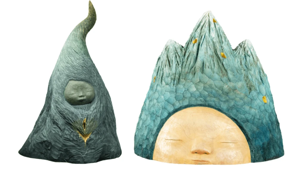 中村萌則以《內在的我》(Inside Me)與《沉睡的山》(Sleeping Mountain)為觀者帶來溫柔的撫慰。她以楠木為材,透過手工雕刻塑造出如森林童話般的孩童形象,他們神情靜謐,卻內蘊強韌的生命律動。作品保留的木紋與刀痕,傳達了成長與夢境的循環性,讓觀者能夠靜靜地感受自然與時間的流動。