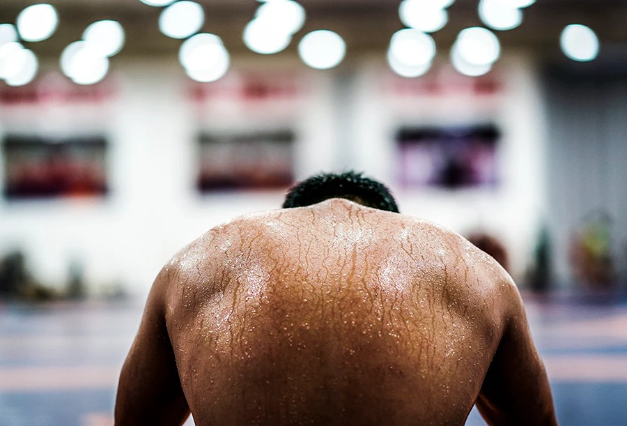 2019年8月8日,中国男子自由式摔跤国家队在北京奥体中心训练,备战2019年9 月在哈萨克斯坦进行的摔跤世锦赛。 图为队员在训练间隙休息。魏征