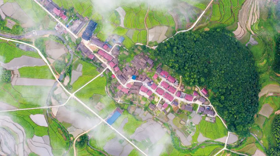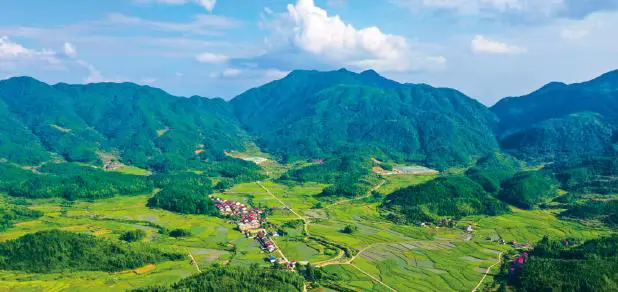 牛田村四面环山,中间有几千亩平坦的土地,因此形成了独特的高山盆地,藏风聚气,风水绝佳。若要一览牛田村全景,必得登高远眺。出了龚氏家庙,可从一条通往县城的小路盘山而上,直抵牛田村的观景台。站在观景台前举目四望,只见古村春容满野,山野中杂花相间,古屋点缀其间,望之如绣。在盆地中央有五座山峰,分别按照东西南北中的方向依次排列,据村里老人所言,五座山峰代表着木、金、火、水、土五神,上千年来,牛田村一直流传着关于五神文化的传说。