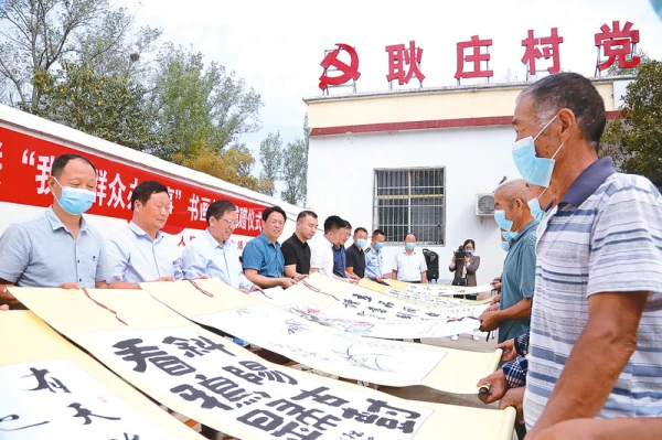 据悉,为喜迎党的二十大胜利召开,贯彻落实市委宣传部关于在全市开展“喜迎二十大 欢乐进万家”十大群众文化活动和市委党史学习教育领导小组关于开展“我为群众办实事”实践活动工作方案的要求,进一步激发广大人民群众奋进新征程、建功新时代的磅礴力量,市文联发挥所属市书画研究院书画家团队优势,结合帮扶对象耿庄村脱贫摘帽之后建设美丽乡村的实际需要,组织69名书画家,历时6个多月,精心创作了650幅书画作品,用书画作品让耿庄村靓起来。