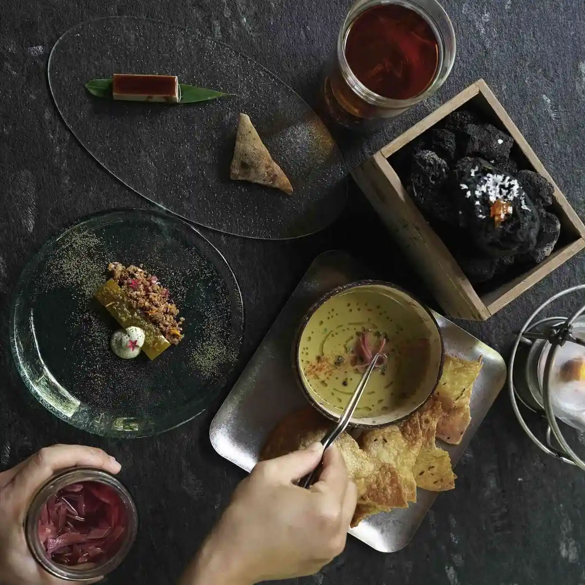 由無礦團隊設計並手工製作的礦食點心組,以純植物為基底的點心組佐一杯飲品,內含芳香生巧克力、煙燻辣椒生巧克力、春茶雪球餅乾與香草琥珀糖,繁複工序純手工製作,滿滿的能量補充作為旅程豐收結尾。
