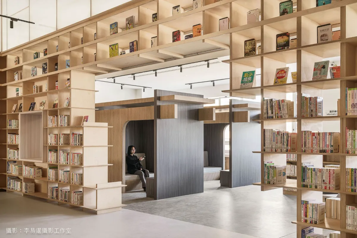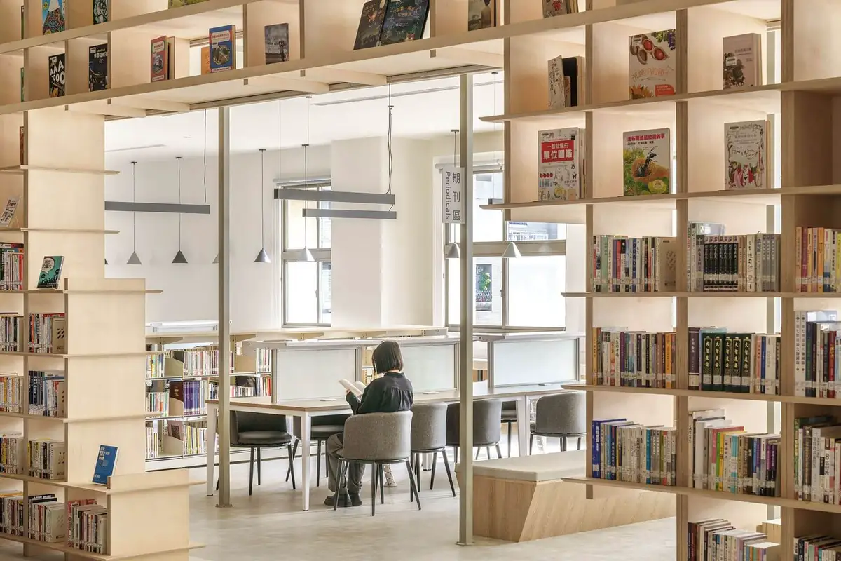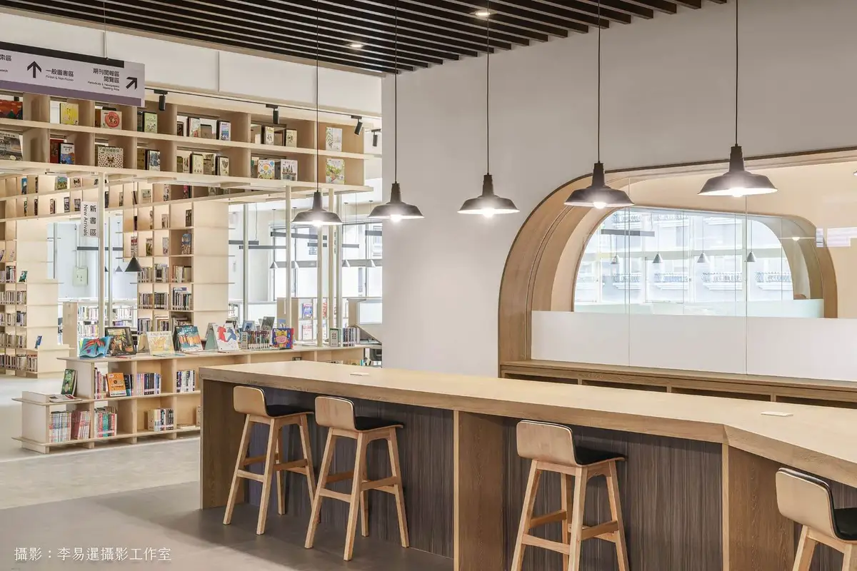 圖書館以沉穩內斂的木質色調為主,營造出靜謐舒適的優雅氛圍;實際上,捨去複雜的空間設計後,讀者的視野方能穿透無礙:閱讀空間以延伸至挑高屋頂的開放式書架為隔間,讓人一踏進圖書館就進入了書的世界。此針對社區居民打造的全齡化閱讀空間,各區規劃有開架閱覽區、期刊閱報區、視聽區、資料檢索區、地方文史區、兒童閱覽區、讀者休憩區、自助取書區,以及多功能活動室等,館內藏書則多達四萬本,期望讀者可以在一個舒適的空間中,依照自己的心情與需求,選擇最想閱讀的書籍。