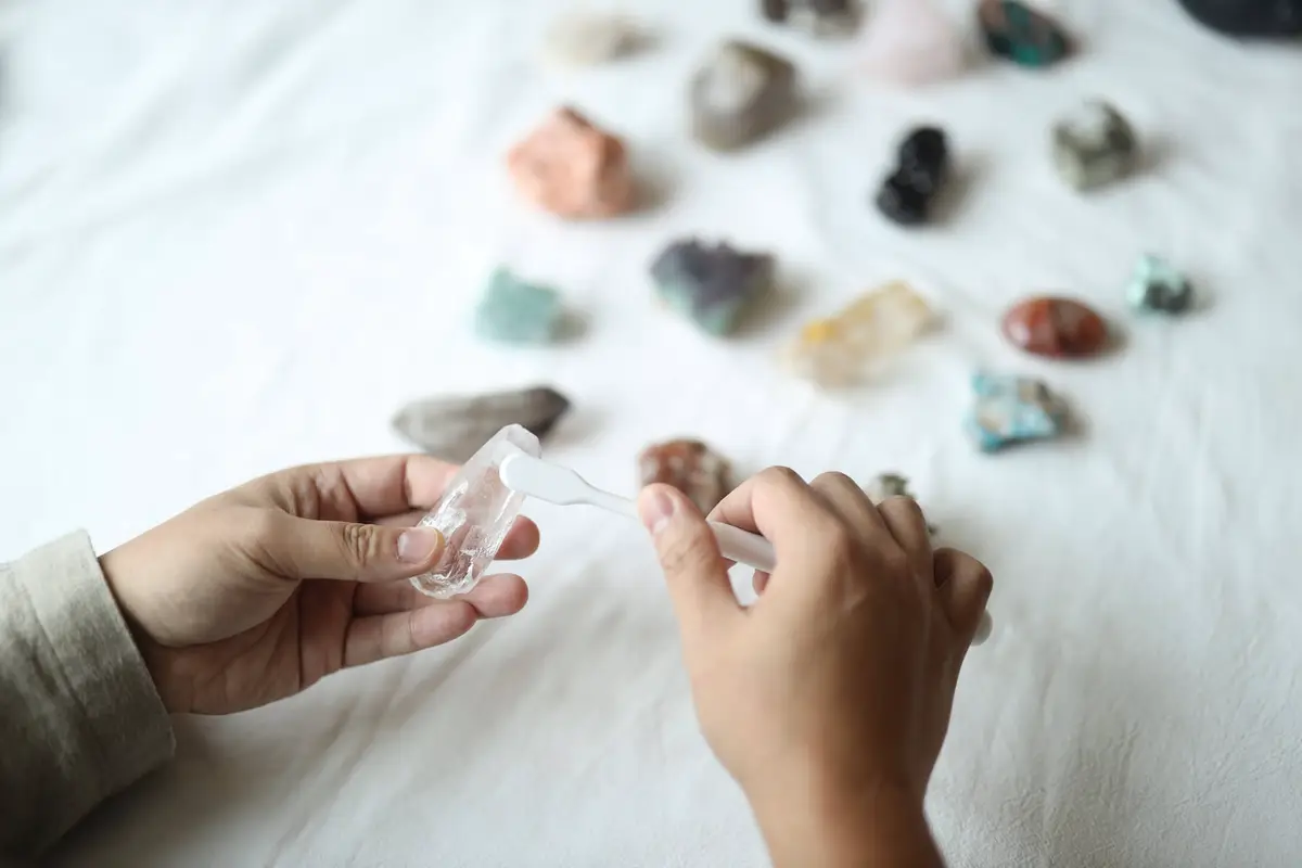 首先是清潔,用軟毛牙刷和吹塵球擦拭掉表面灰塵,最少兩周一次即可。再來是淨化,沖流水、曬日 / 月光、燒鼠尾草和線香都是常見的方法,但因礦石各自不同的特性,有溶解、褪色、燻黑的風險,闆班最推薦的萬用方式是聲音淨化:敲打頌缽或音叉,用單一頻率的聲波安穩礦石的能量波。那怎樣算是養得好?「只要看起來清透就是好的狀態了——水晶的養護沒有大家想得那麼麻煩,以最簡單的方式把它弄乾淨,能量就會出來。」