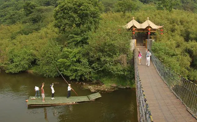 穿过铁索桥,走进竹海,享受竹海宁静的朝阳。走在竹海里,深邃的尘埃空气清新,清爽,豁达;徜徉竹林,在竹楼歇息。感受“青色入壶绿,竹影溢茶香”。