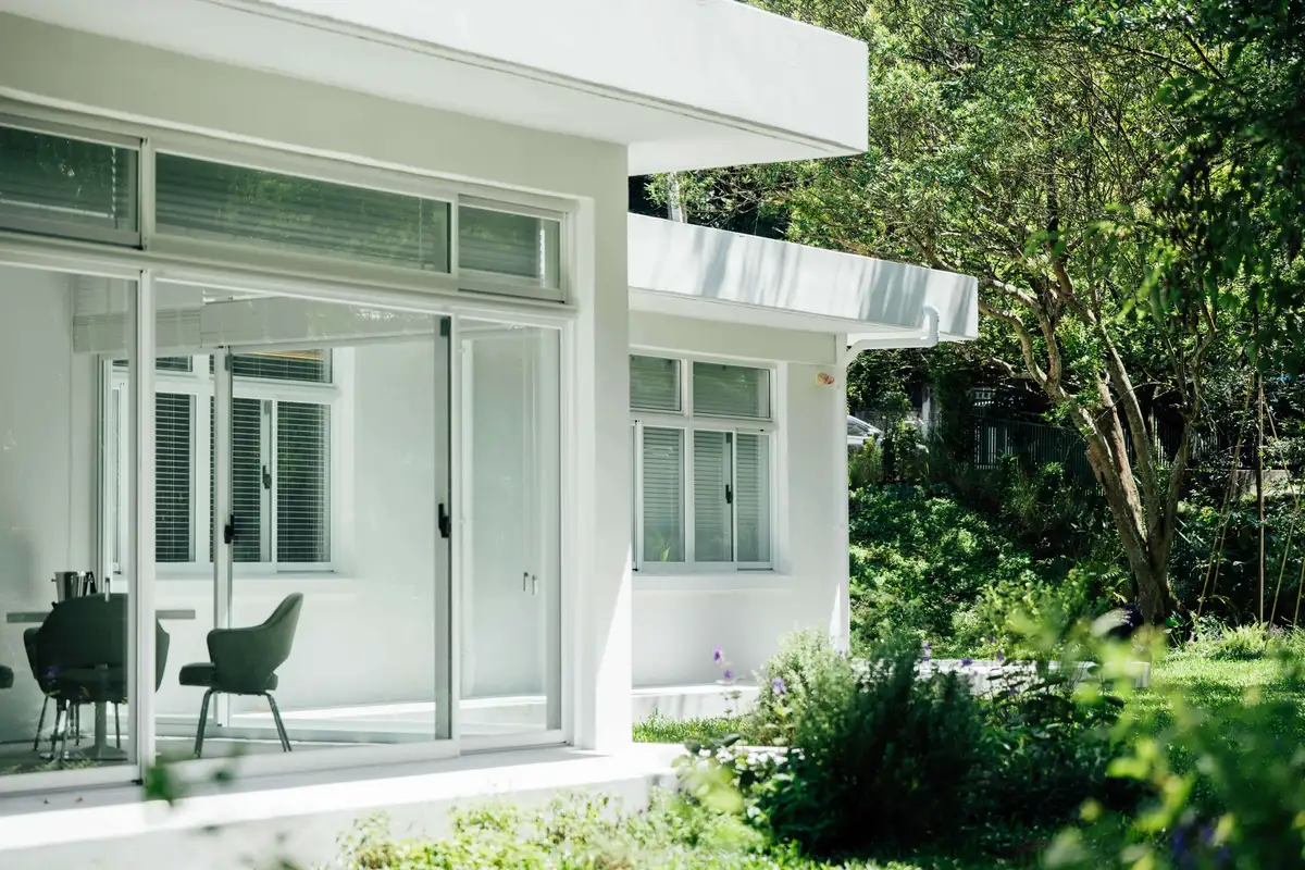 原為1950年代美軍宿舍,建築承襲當時美國的「世紀中期現代主義(Mid-century Modern,簡稱MCM)」風格,以全白色建築搭配修剪整齊的草皮綠地,展現出簡潔理性的現代美學。而在吳書原的景觀構想中,在保留MCM精神的同時,他試圖融入「副熱帶現代主義(Sub-tropical Modernism)」的設計語彙,為這片空間注入更多有機生命力。