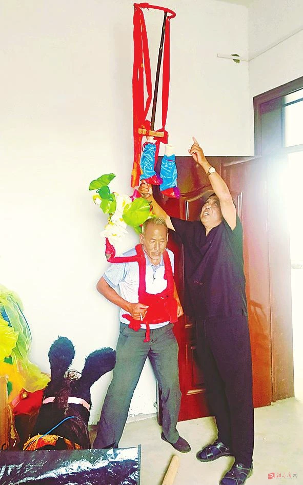 上层架子,从扛装头顶向上竖一根110厘米长的钢筋柱。柱的下端接在下层装架上,上头安装一个半圆形卡子,用两根相等的绳子吊着一个30厘米长的木板,上装儿童站在木板上,用布扎带固定在铁柱上,扎紧全身,上下两层装架高2米,扛装人和上装儿童上下总高4米左右。