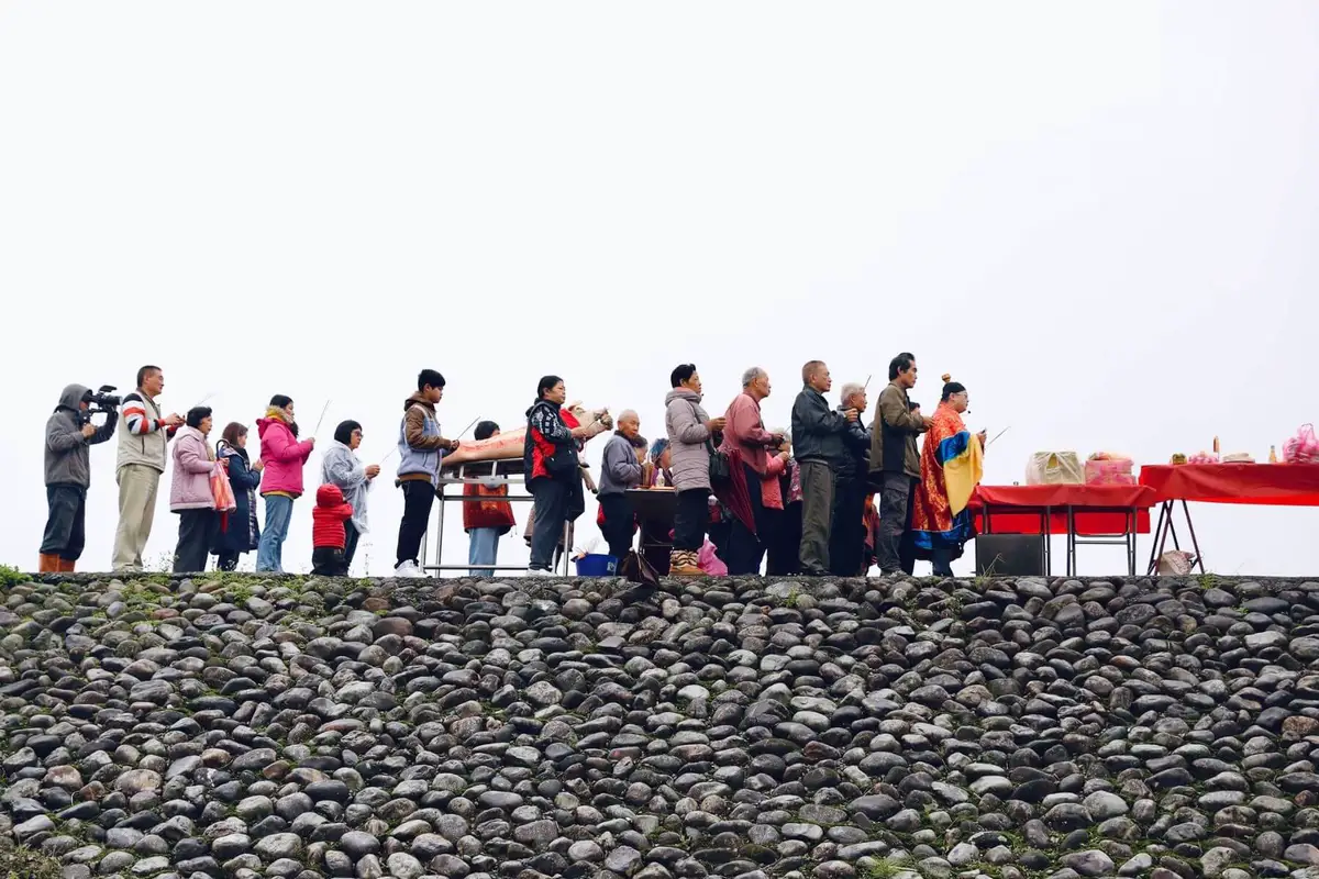 而後,水勢轉彎,並且慢慢退去。此後至今,每一年農曆12月16日的尾牙,員山堤防邊的幾個村落都會聯合「拜駁」(拜堤防)。經常下著宜蘭秋冬特有的綿綿細雨,村民們顫顫巍巍地扛豬公,上到狹窄的堤防頂,擺設鴨賞、臘肉。感念天公、水神、老大公守護境內平安,從來不敢怠慢。