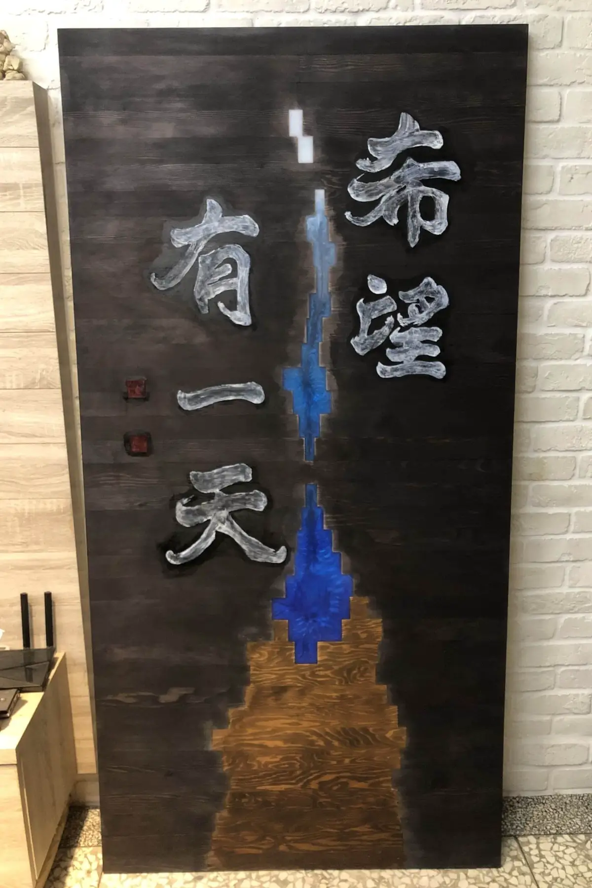 頭城梗枋的北關海潮公園中,因在地特殊風景地形,用「天風海濤」形容這裡的地形地貌,代表天風時送好春來,並書寫成石頭作品存放在公園中。康潤之老師為了和過去對話,選擇海潮公園裡的景觀一線天,藉由現代白話和早期祖先康灩泉在山老人的詞句去做呼應。⠀「希望有一天」五字靈感來源於駐村、在地居民的對話過程,了解到因雪隧開通遊客減少,而大家努力撐過疫情後,仍然對未來充滿信心與希望。正好「天風海濤」也象徵著希望,而公園中的一線天帶著希望曙光,以此作為連結,期許前方有光,希望長存。素材則選擇石頭、大自然的木頭為背景,接著把二創雕成的字體作品貼於木頭背景上。字體選用透明的塑膠,也代表「希望有一天」,人類所製造的垃圾能夠一點一點地消失。