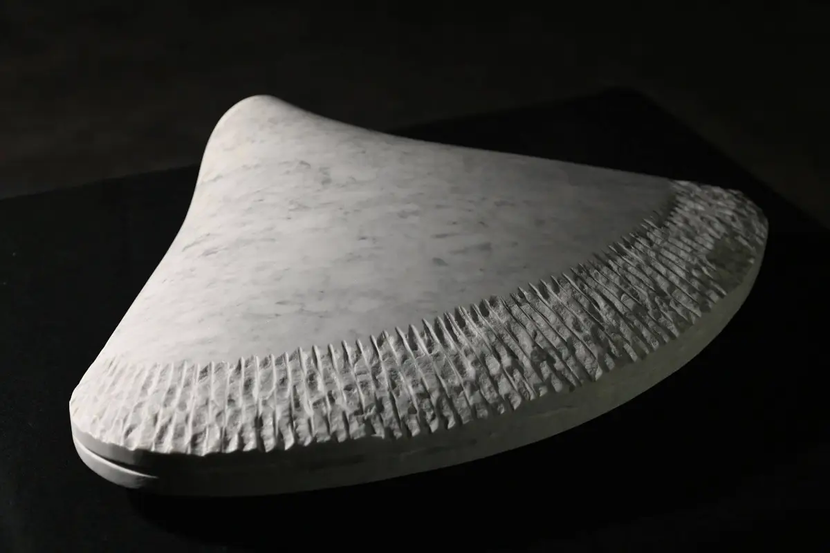 真珠使用義大利卡拉拉白色大理石來創作,細緻紋理在淡雅的白色基調中流竄。溫岳彬老師利用最簡單純粹的線條描繪頭城五漁村,將貝殼微微張開的曲線勾勒成海岸線的美麗風景。並刻意保留人為的切割與雕鑿的痕跡,透過光影的交錯變化象徵在地人建設五漁村的歷史軌跡。而粗獷的鑿痕則昭示此地複雜多變的海岸景觀,真珠簡單俐落的形體藉著光影的烘托,展現出最純粹、單純的古樸與優雅。