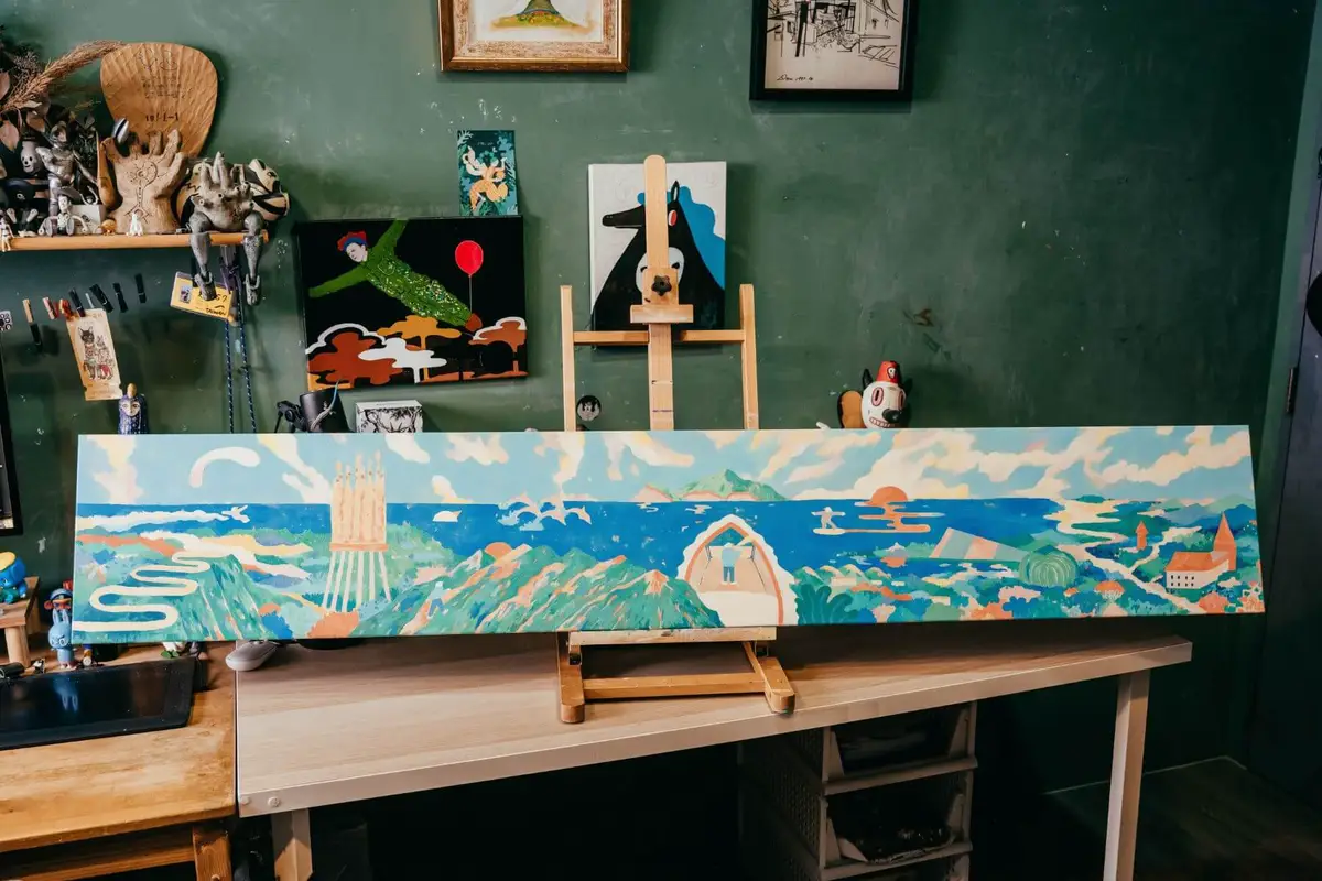 草嶺古道的翻山越嶺,龜山島上的乘風破浪,熱血澎湃的搶孤,充滿童話般浪漫的伯朗城堡,結合當地特色的建築蘭陽博物館,都成為這片海灣的生動故事。吳騏老師用畫筆記錄下五漁村的美麗與多樣性,呈現這片海岸的生命力,老師也希望這件作品能成為五漁村風景的一扇窗,讓大家打開窗,看見五漁村更多樣化的美。