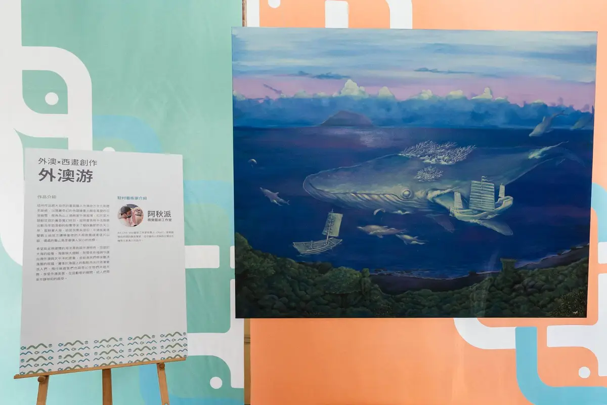 許智陽老師希望能呈現遼闊的海洋景色與外澳特色——悠遊於大海的船隻、海豚與大翅鯨,帶來祈福與守護台灣外澳與太平洋的意象,並給漁民們帶來豐沛漁獲的祝福。灑落於海面上的點點亮光代表著衝浪人們,飛行傘遊客們也與奇幻生物們共遊天際,享受外澳美景。在這動態的瞬間,給人們帶來平靜祥和的感受。