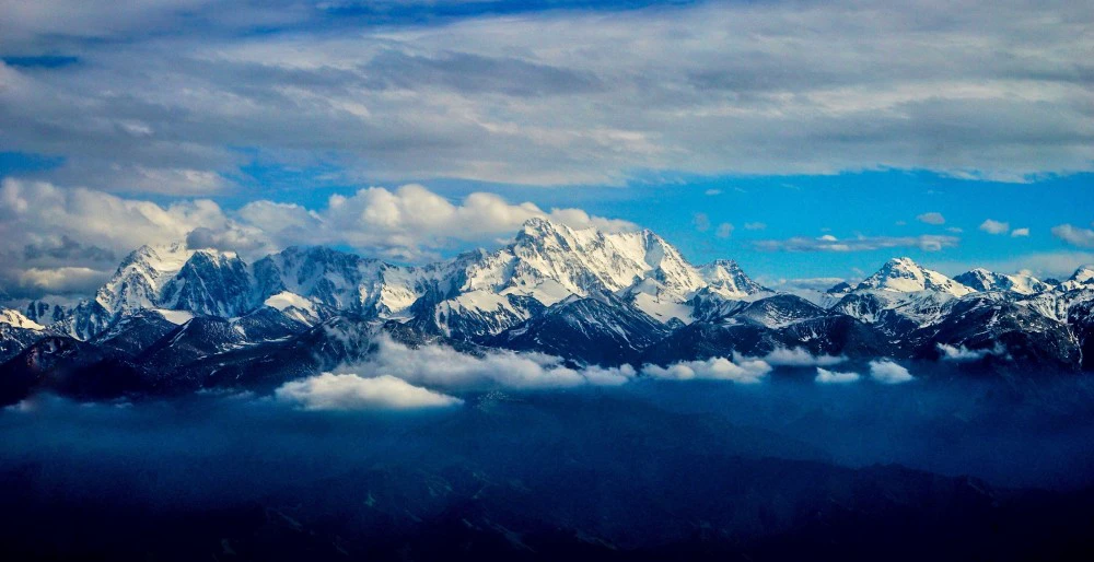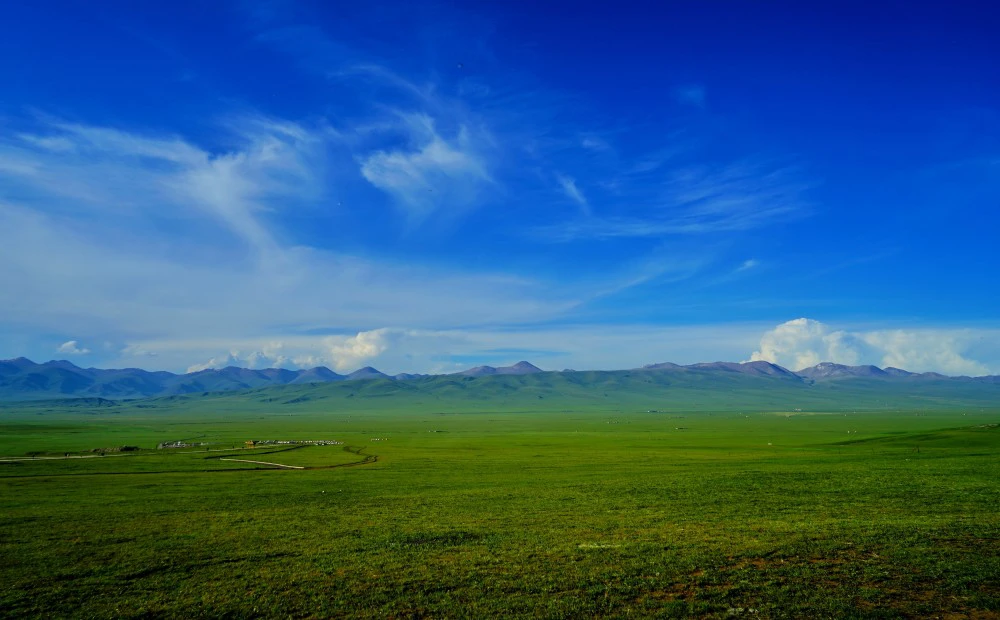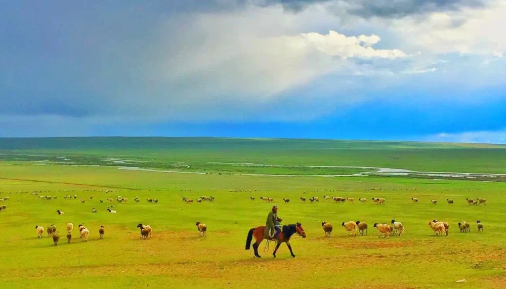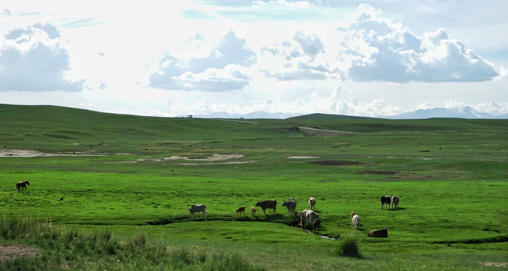 整个草原一望无际、绿草茵茵,满山遍野全是羊群。 河边的空地上散落着几顶白色的毡房,草原上的蒙古人骑着马在山坡上自由地游荡。 毡房的烟囱冒着缕缕白烟,袅袅升起,给这片草地和这座雪山带来了一丝人间的烟火。