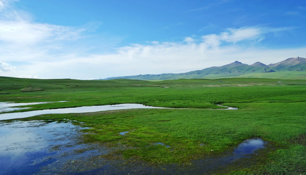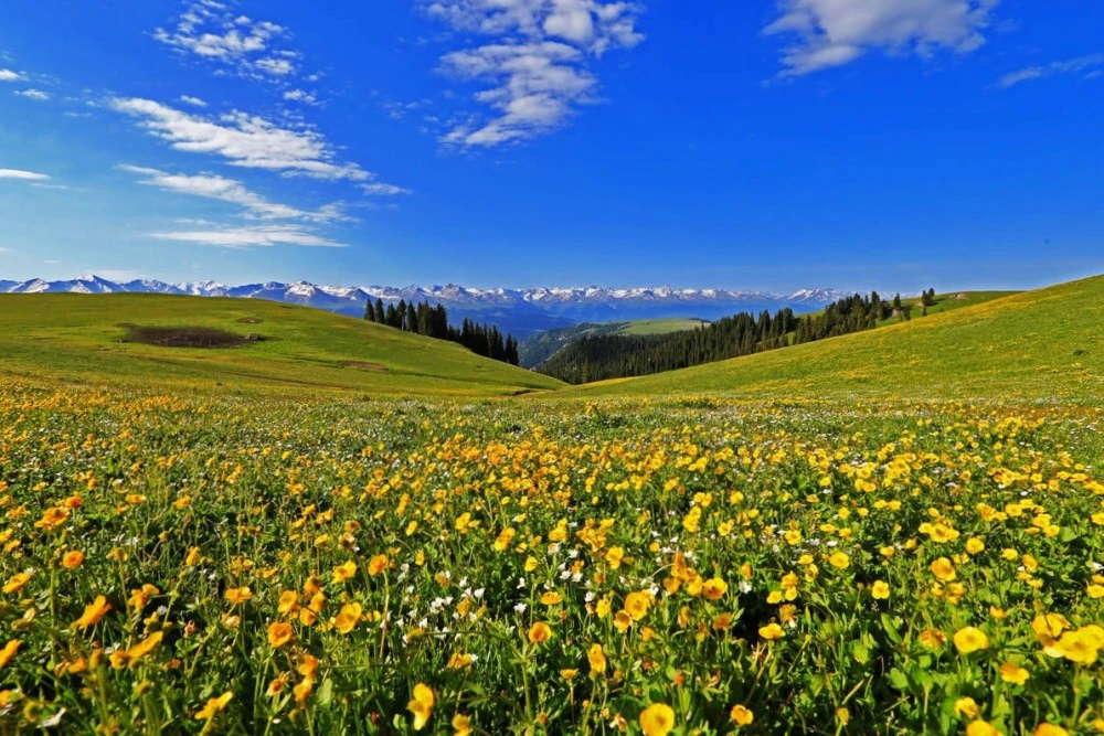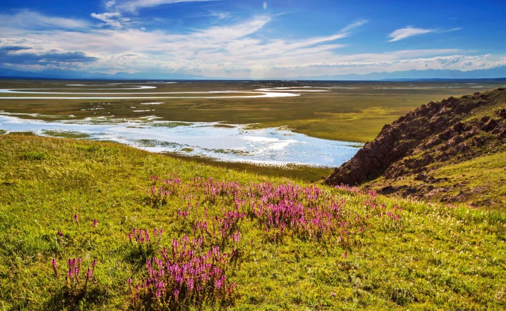 每到仲夏季节,巴音布鲁克草原层峦叠翠,绿野无限,鲜花盛开,争奇斗妍,湖沼广布,牛羊遍野,雪莲似的蒙古包坐落其间,一片兴旺繁荣的景象。