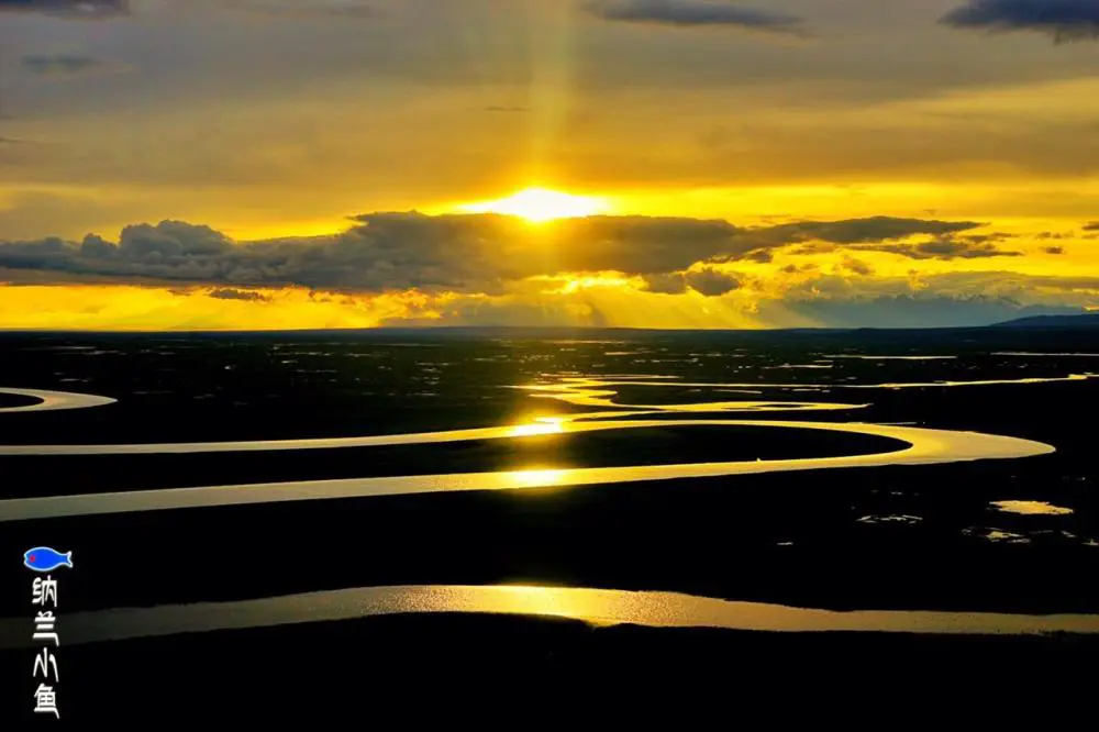 开都河的九曲十八弯,分外迷人,尤其是日落时分。 弯弯曲曲的小河蜿蜒在静谧的草地上,静静地流淌向远方。 夕阳的余晖洒在每道河的河湾上,美丽万分。 一阵风吹来,河面泛起一片粼粼波纹,好像数不清的明眸一眨一眨。