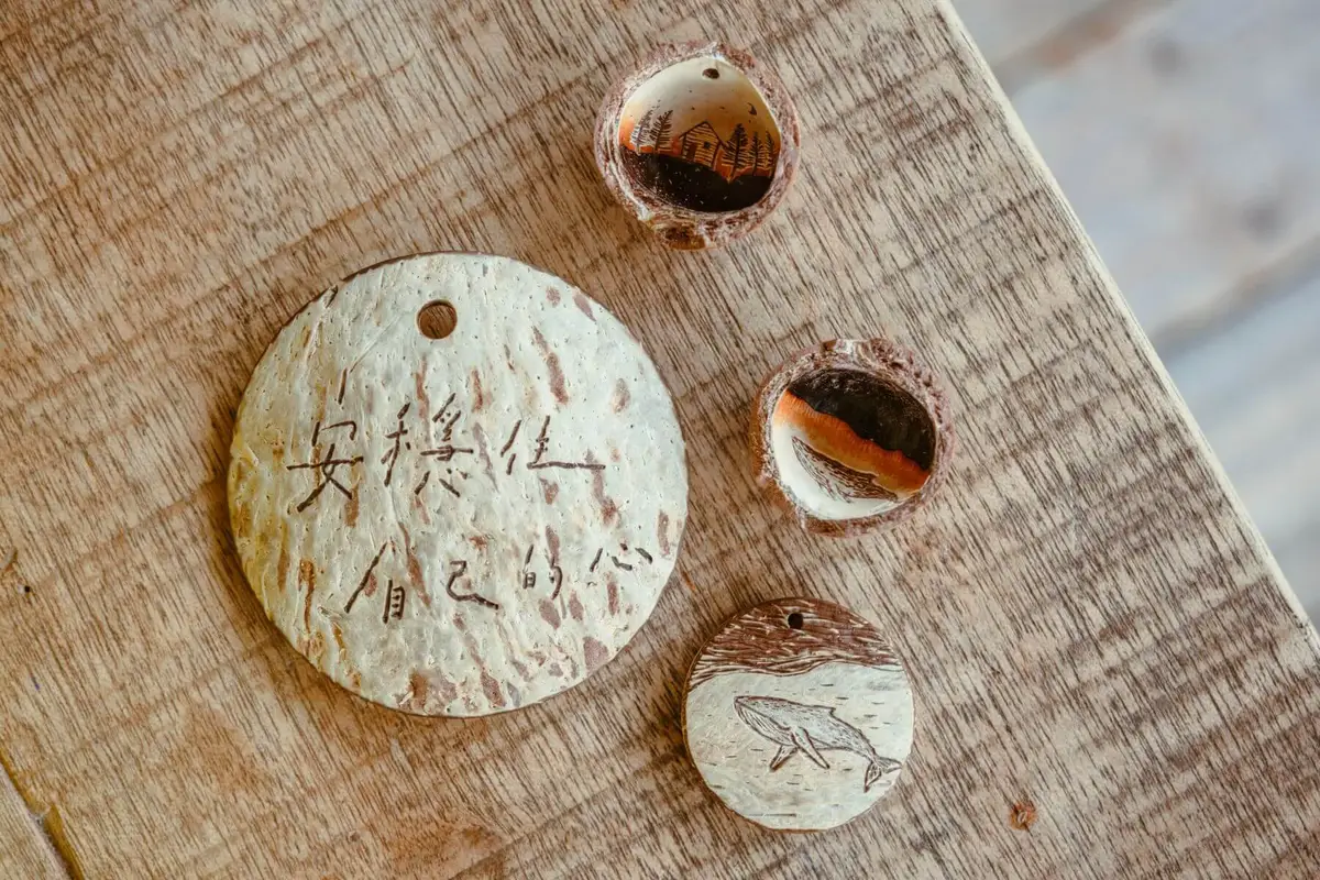 從小在西部鄉間成長的以蹦和小朱,一人有著來自台東池上的阿美族血統,一人嚮往成為真正的島嶼孩子,兩人在都蘭遇見彼此便決定成家。從11年前收集舊木料慢慢找出在木頭上刻字的創作方向,發展出「美好歲月」品牌,不適合刻字的木料成為自蓋家屋的未來想像,兩年前在都蘭海邊以4.2坪的「暖築」為屋,延續舊木料刻字創作也在都蘭找到椰核等新媒材,並開放「迷你豐盛的椰子體驗」在東海岸喝椰奶、烤椰肉,製作椰子碗。