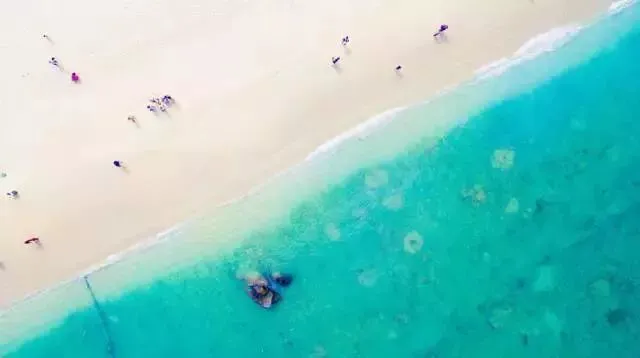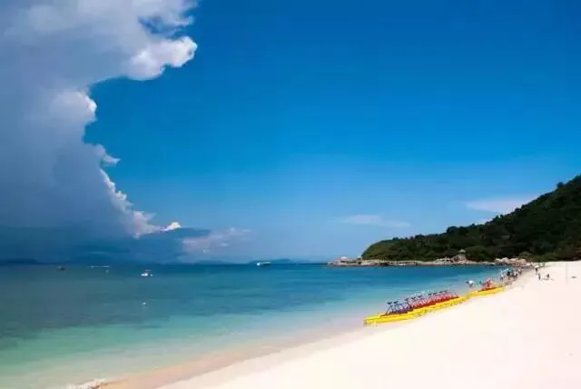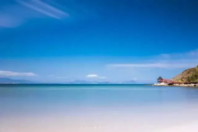 一弯玉带状的银色沙滩,沙质均匀细腻,海水颜色明丽动人,层次分明。