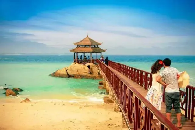 情人桥原来是座铁索桥,是当年守岛部队的海上瞭望点。走在铁索桥上摇摇晃晃的,需要几分胆量和机灵,过桥时往往会紧紧抓住朋友的手不放,因此这桥又被戏称为“情人桥”。