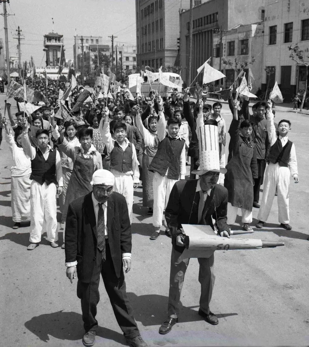 城市里的大游行一直是你广为人知的创作主题,而宏大的场景本身也十分吸引人眼球。拍这些照片时有什么特别的方式或心理活动?那时听到外面敲锣,人们就开始出门。中山路改名成了人民路,鼓楼广场改名成了人民广场,玄武公园改名成了人民公园,胜利电影院更名为人民电影院等,这些变化拍照都能记录下来。因为有可见的事实作为依据。那时候大家很信任摄影,但往往事与愿违。有时候我出去拍照,感到气氛过于热烈,我都会离得远一点,可能是因为这样我才有了很多大场景的接片。有的照片中人山人海,也许在哪一排的人群中能看到我儿子,学校常常组织他们上街游行,我都拍了下来。1964年8月10日,南京市在新街口广场召开万人抗美援越大会,声援越南人民抗击美国侵略、保卫祖国的正义斗争。广场上人山人海,群情激昂。如何通过图片宣传来表明南京市人民坚决支持越南人民正义斗争的态度是我当时面临的问题。我在会场周围转来转去,很难找到理想的拍摄角度。我们在广场上架了高梯子,但也只能拍些人们高举毛泽东主席和胡志明主席画像、打着旗帜和标语、高呼口号的游行照片,无法反映这声势浩大的群众性集会。我想,只有利用广场旁中国银行大楼的楼顶了。以前我曾在楼顶上拍过节日群众游行队伍,三张接片就可以了,而这次再用三张接片也包容不了那么多群众,我考虑再三,决定拍六张试试看。禄来相机方形磨砂玻璃取景器内有水平线,我按水平线取景,在现场上下左右移动,果断地拍了六张。这是我摄影生涯中创纪录的接片,放大拼接以后,《新华日报》8月11日在第一版的显著位置刊登了这幅照片。你拍的那些事件、场景大多看上去广阔,画面构图激进的近景并不多。我很多时候同一个场景也会拍好几张,往往我会觉得画面中那些人物闭着眼睛的瞬间,比眼睛睁开的所谓“好照片”更好,或许是这种选片给你带来了一些感受。另一方面,很多照片拍了,但有些也不大敢去拍,因为担心会给别有用心的人抓辫子。即使有时忍不住拍了几张也要上交。以前交上去的照片我曾去找过报社有关人员,他们说工宣队进驻报社后全给烧了。其实我曾经也拍过很多有暴力、有痛苦、有灾难的照片,只是未能留存。是我自己做的。最早是一个之前在中央通讯社工作的暗房师傅教我。不过有些后期调整很麻烦的也有美术组的同事帮我。有一次我去拍1959江苏省科学技术协会成立大会会场,一般拍接片我会先拍摄中间的画面,再拍两边。但那一次我把闪光灯使用程序弄错了,中间的画面因为台上有强光灯照射画面基本清楚,但四周的场景就欠光照。回去以后,暗房师傅一看不行,我们便找到美术组。当时摄影组和美术组是一起办公,我们一些照片经常请美术组的画家帮忙修整一下。特别是拍摄会场上一些反光的红底金字的横幅,或者多张接片等。这次我拿着相片找到画家柯明,他用笔蘸着墨水一点点将人物背影加深,再用灰色将轮廓勾出,所以那张照片最后上面参会的人都和火柴棒似的排列整齐。好在当时印刷条件差,新闻纸质量也低,最后蒙混过关。