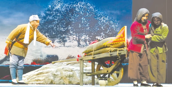 两个小时的演出,来自商丘演艺集团的专业演职人员为现场数百名观众献上了这台以淮海战役为时代背景的大型现代“红色豫剧”《小推车》。淮海战役的主战场位于豫、鲁、苏、皖接壤处。豫剧《小推车》讲述了解放战争时期,生活在豫东大地上的人们在中国共产党的领导下,手推小车,冒着炮火,穿过硝烟,前赴后继为解放军送给养,为夺取准海战役的最后胜利立下不朽功勋的感人事迹。