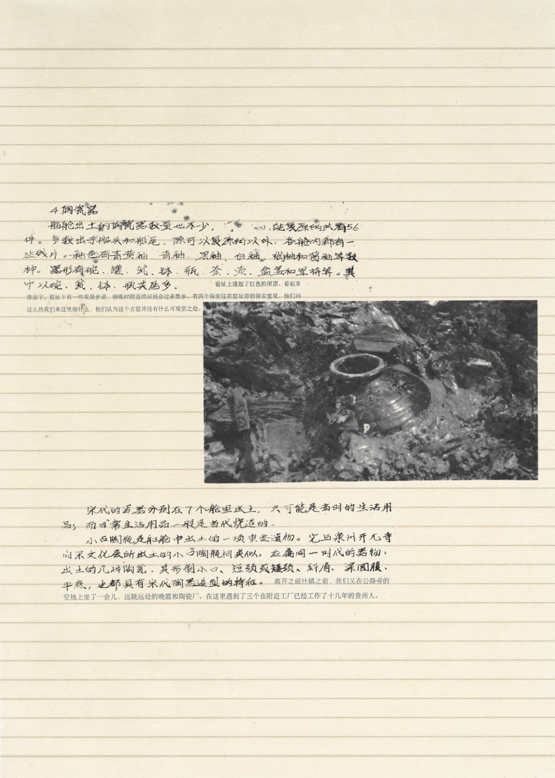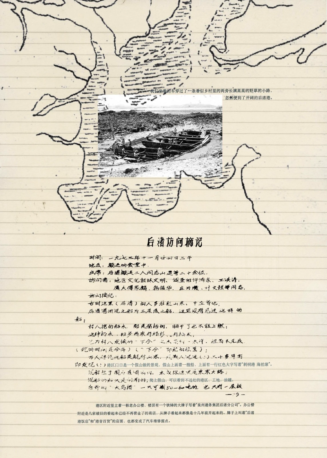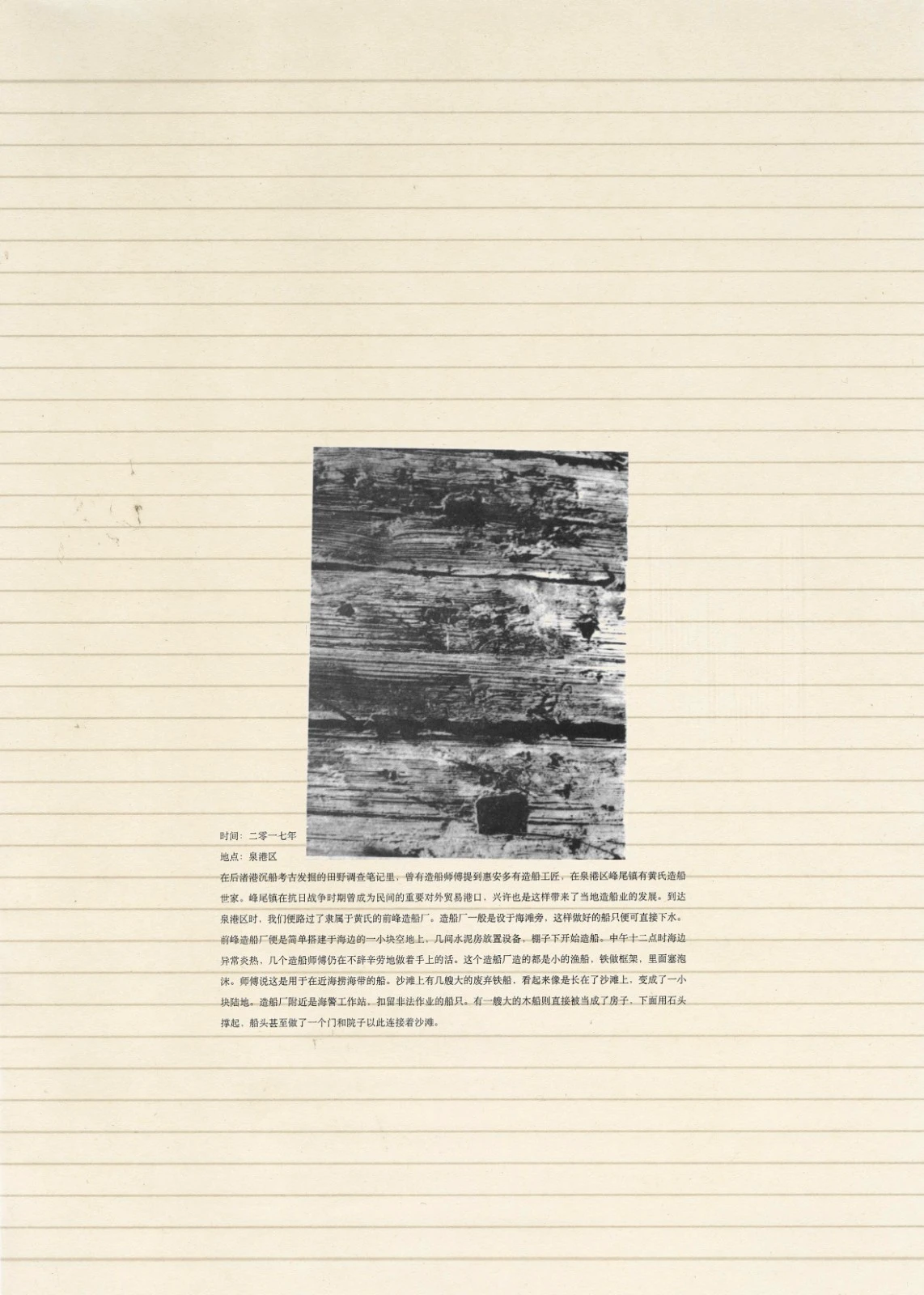在今天的全球化背景下的泉州港,仍旧是引人注目的地区,凭借着海港的优势,泉州地区迅速进行着现代化与工业化,获得了巨大的经济发展。然而这里为我们保存了一段什么样的历史,历史又在今天留下了什么样的痕迹,是我从四十多年前的那次沉船发掘再次出发,想要去找寻的泉州现实。我将自己看作沉船发掘小组的一员,重访那段泉州港历史中的地点,考察那些自古代的泉州港便存在的重要的当地制造业,呈现一个充满差异性的泉州地区,一个历史与现代并存、农业与工业共存的地方性景观。作品将两次“发掘”并置,它帮助我再现一个港口的地方史,实现一次也许素未谋面的对话。