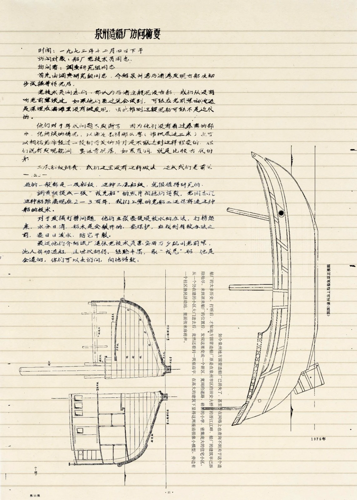 1973年,在泉州湾后渚港附近的海滩上发现一艘宋末时期的沉船。经过一年的考古发掘与数年的调查研究,古船发掘小组将一段古代泉州港的航海与商贸历史呈现出来。这艘宋末沉船被认定为目前世界上发现的年代最早、规模最大的木帆船,它向人们展示了中国古代高超的造船工艺的同时,沉船上遗留的物品也成为了当时繁荣的本地制造业与对外贸易的直接证据。沉船作为一个指引,指向了一段已知历史的方方面面,也为这里的人们指向了更多的未知。