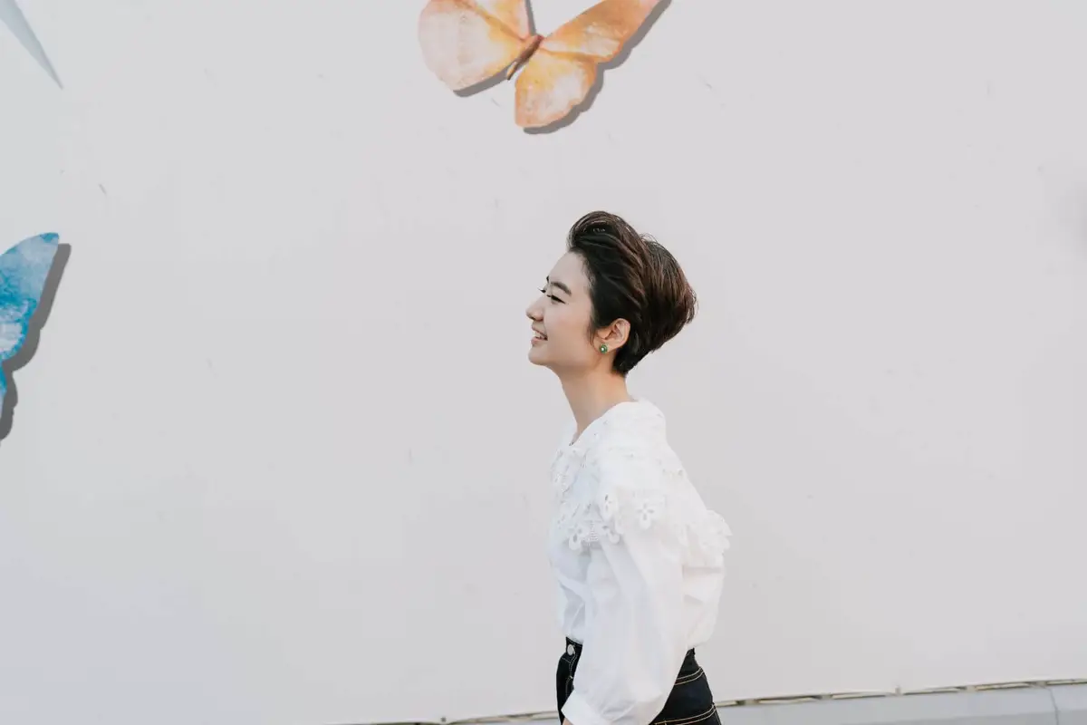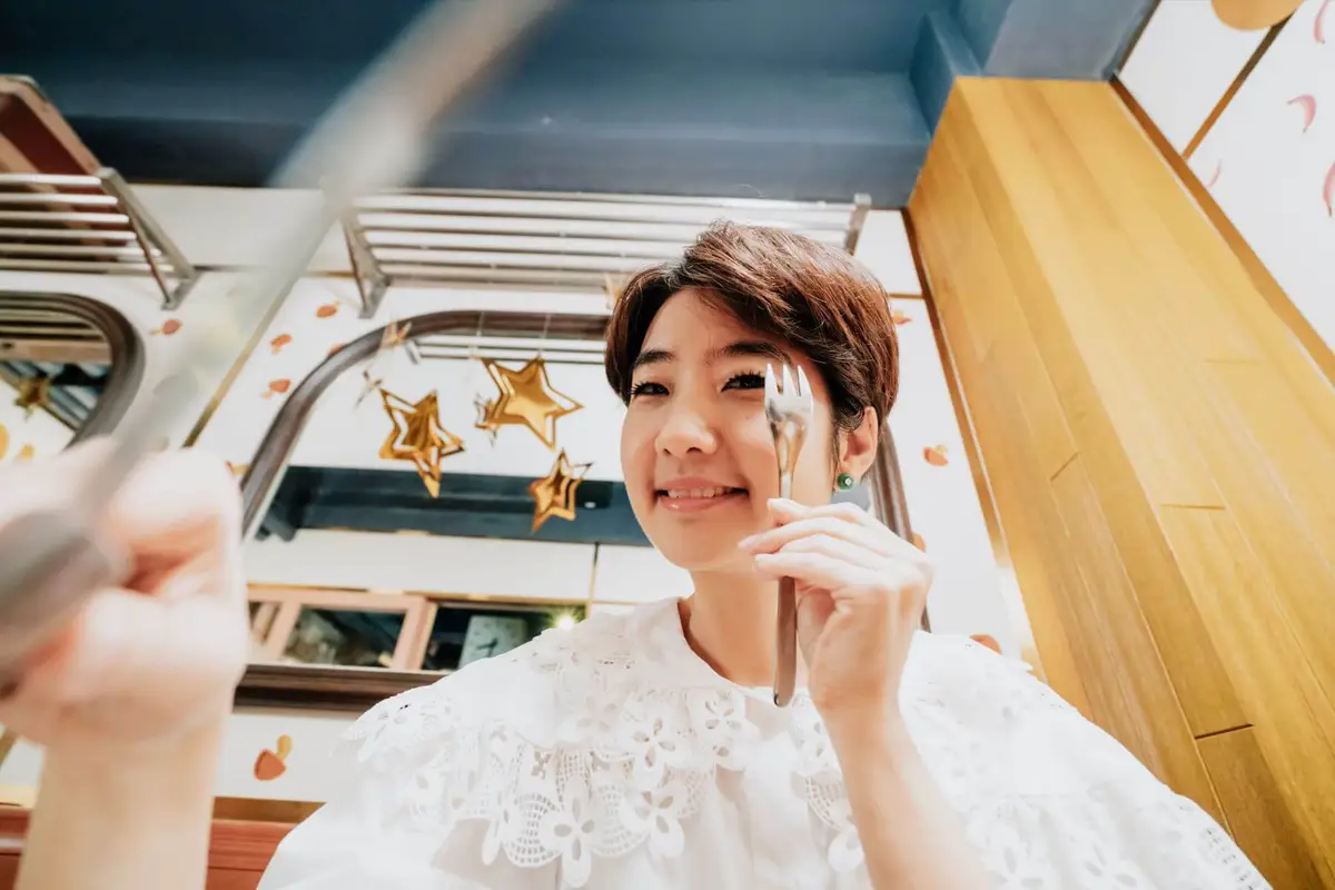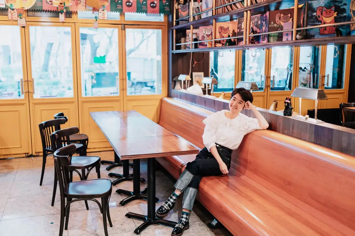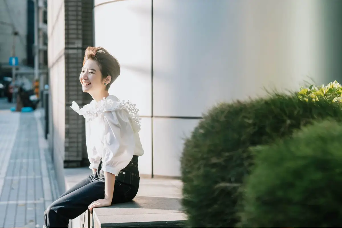 攝影師一路上快門不停,女主角看來也游刃有餘,光源在何方,唇角怎麼笑,手勢怎麼放,她已相當熟練,連攝影師也忍不住稱讚:「妳很好拍耶。」誰能想到,兩年之前,她還是那位在鏡頭前一分鐘就笑僵、十分鐘就尷尬癌發作的女子。
