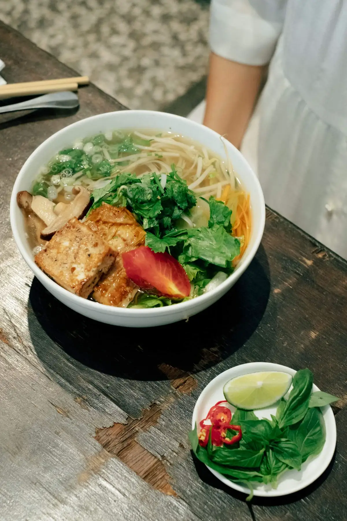 小夏天餐廳的老闆因為熱愛越南文化,特別在越南學了料理,羅漪文說這裡與她在越南當地吃到的味道幾乎一模一樣。圖為小夏天的「蔬食湯河粉」。